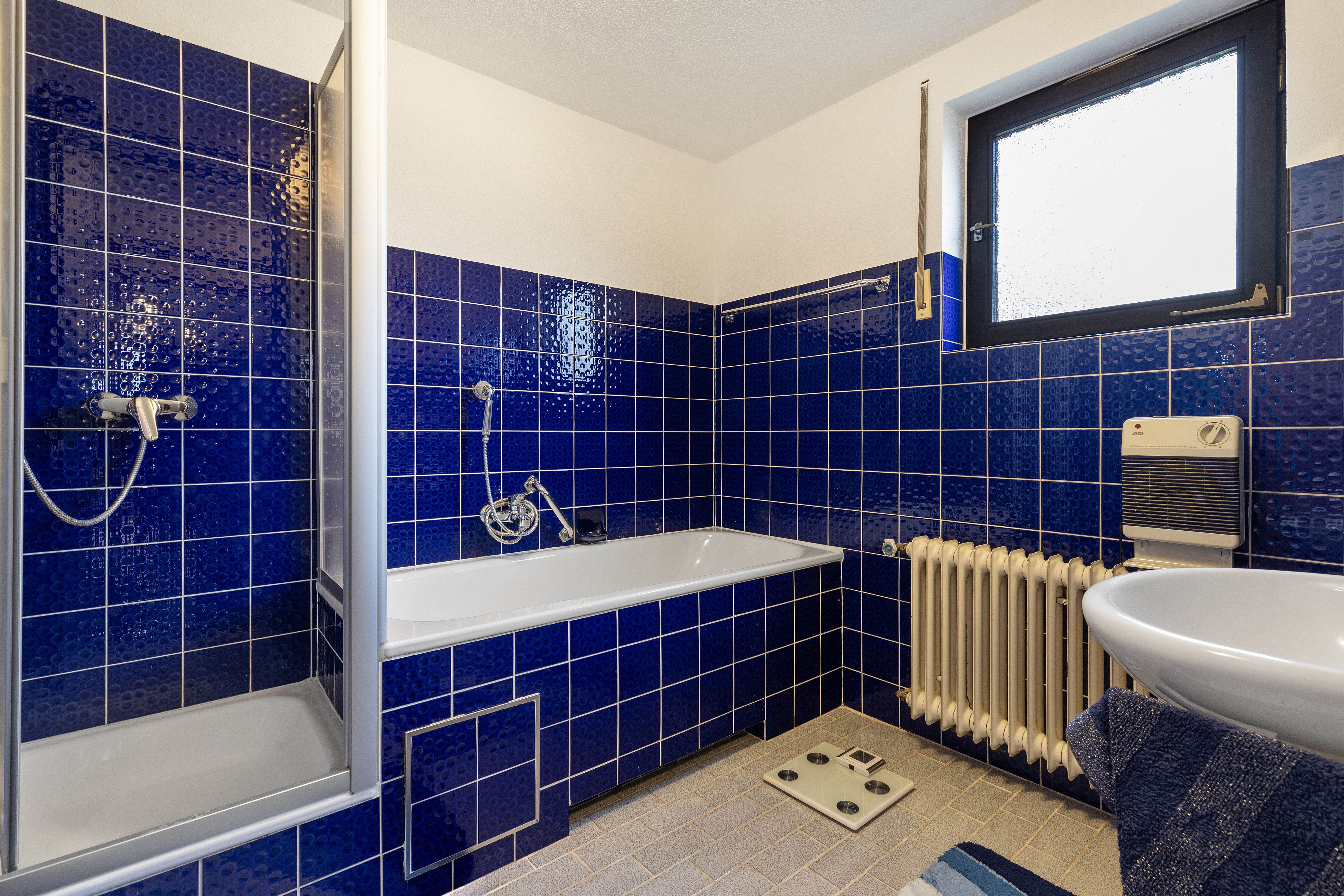 • Zwei Badezimmer mit Badewanne und Tageslicht, gepflegter Zustand (Retro-Flair in Blau)