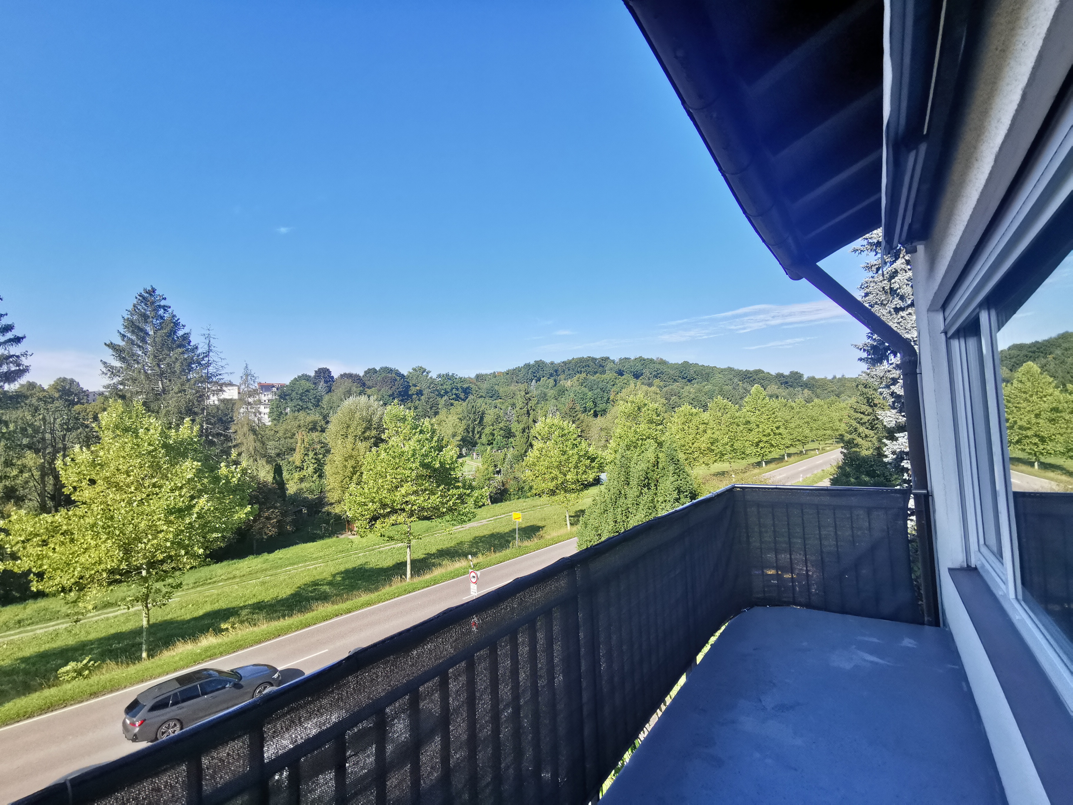 • Sonniger Balkon mit Blick ins Grüne